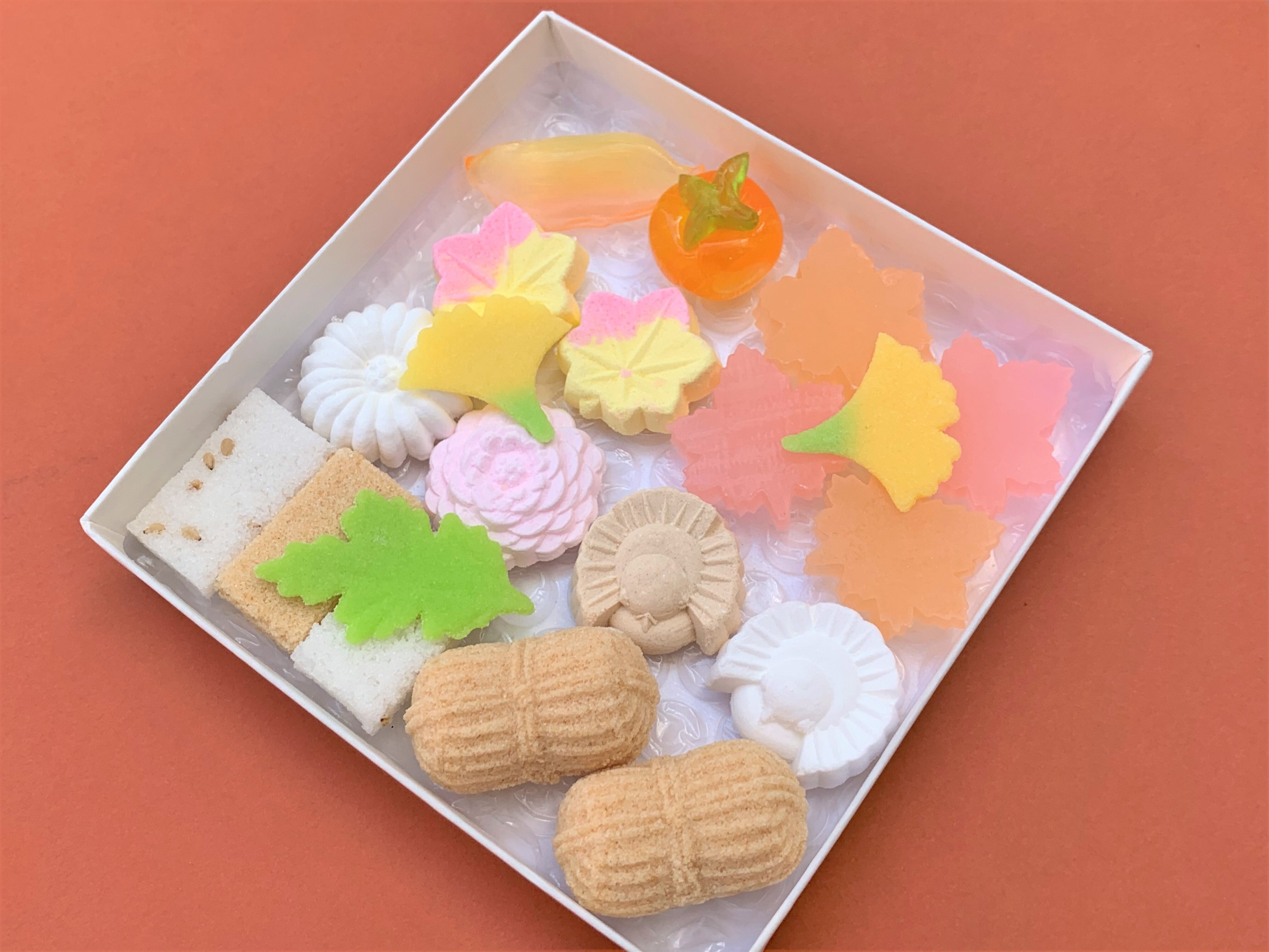 有平糖でできた柿や照葉、紅葉や銀杏・菊花に愛らしい福良雀など、秋の彩りが詰まった かわいらしい お詰合わせです。