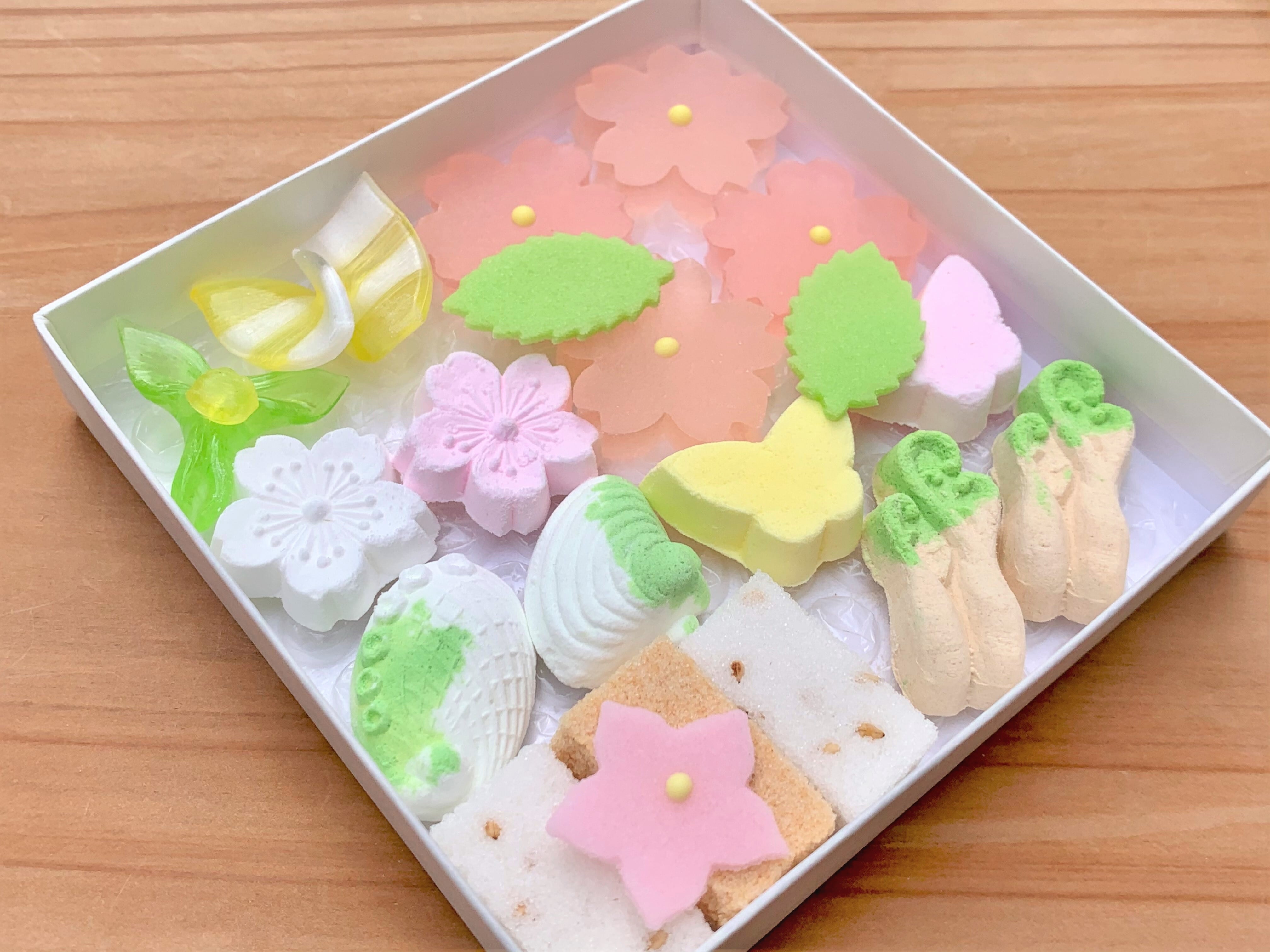 咲きほころぶ桜や桃の花、春の訪れを喜ぶ蝶や蕨が入った春らしい お詰合わせです。