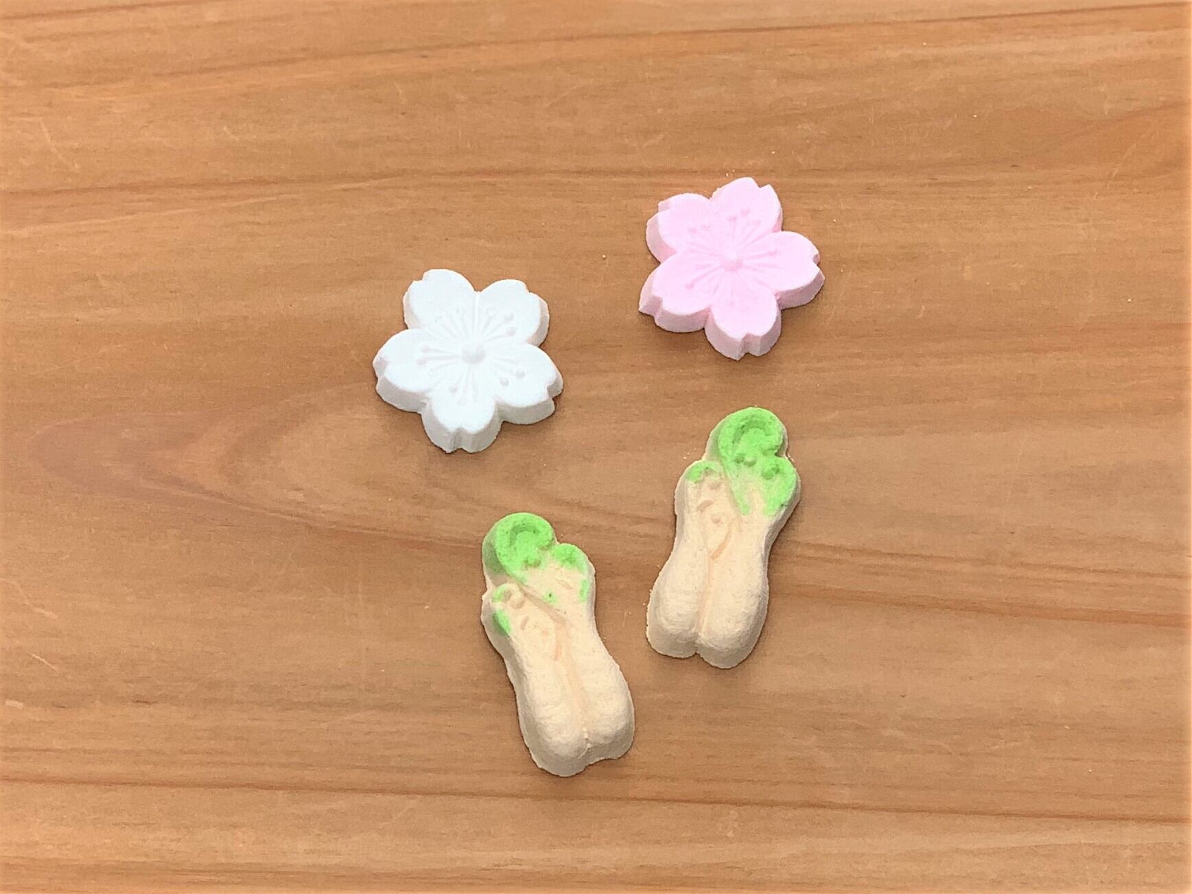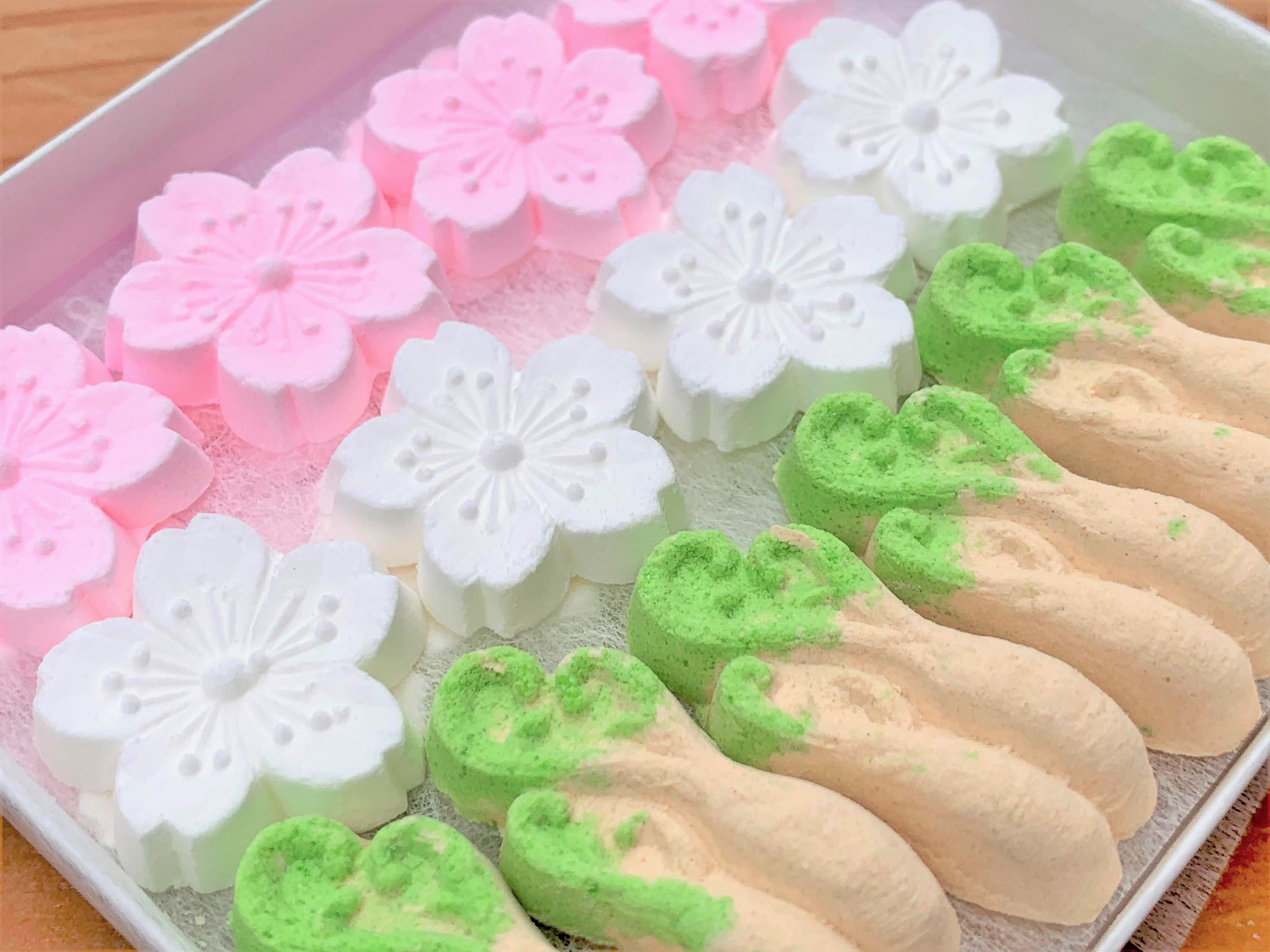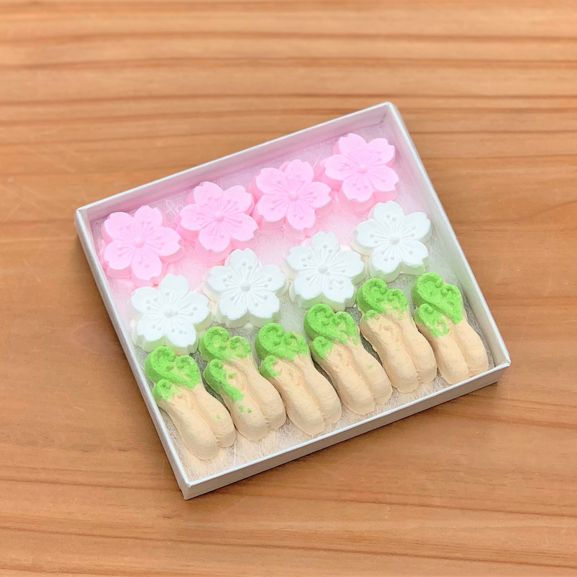 紅白の桜と茶色に緑ぼかしのわらびの詰め合せ。