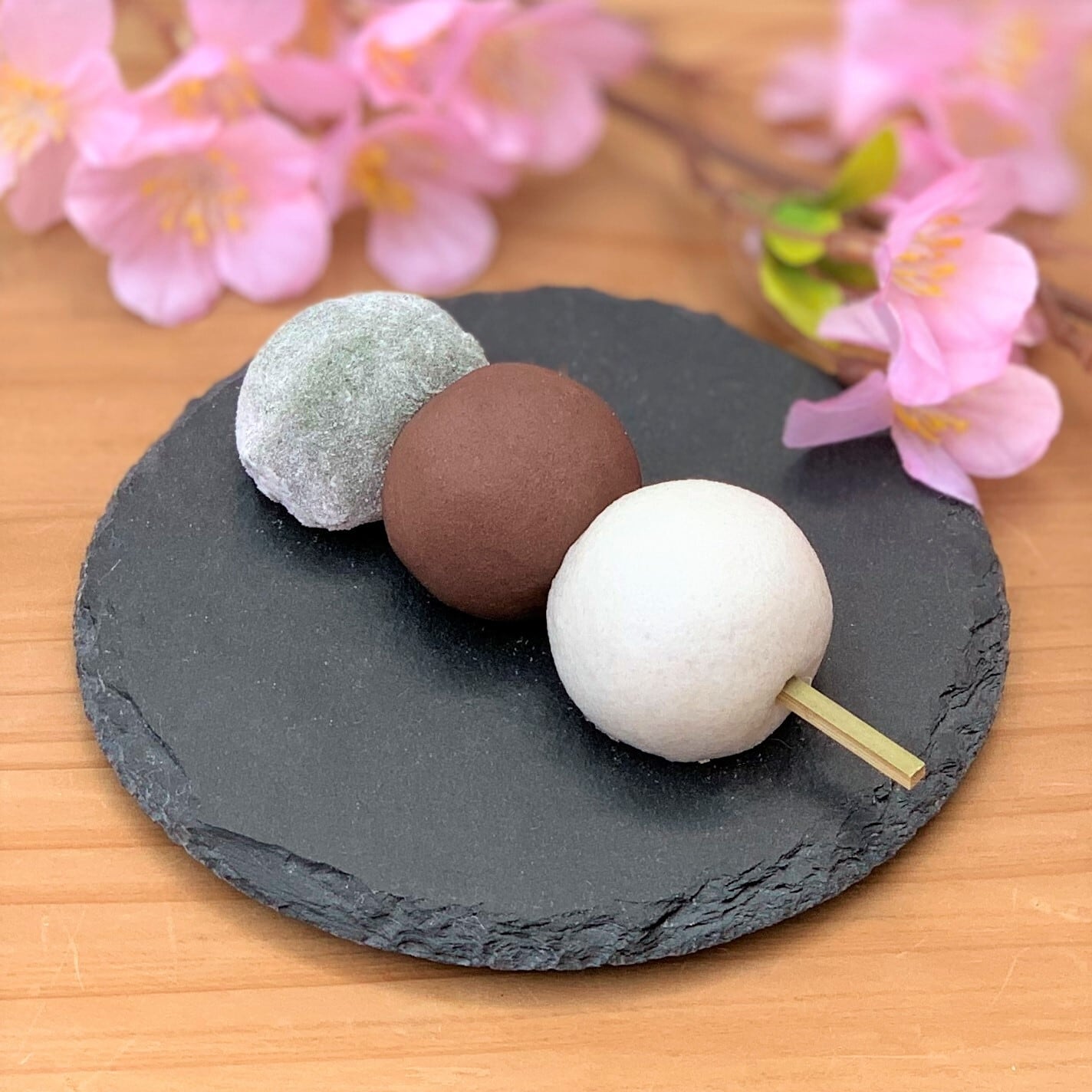 当店の花見団子は、よもぎのお餅・こし餡・薯蕷饅頭でお作りしており、3種の異なるお味をお楽しみいただけます。