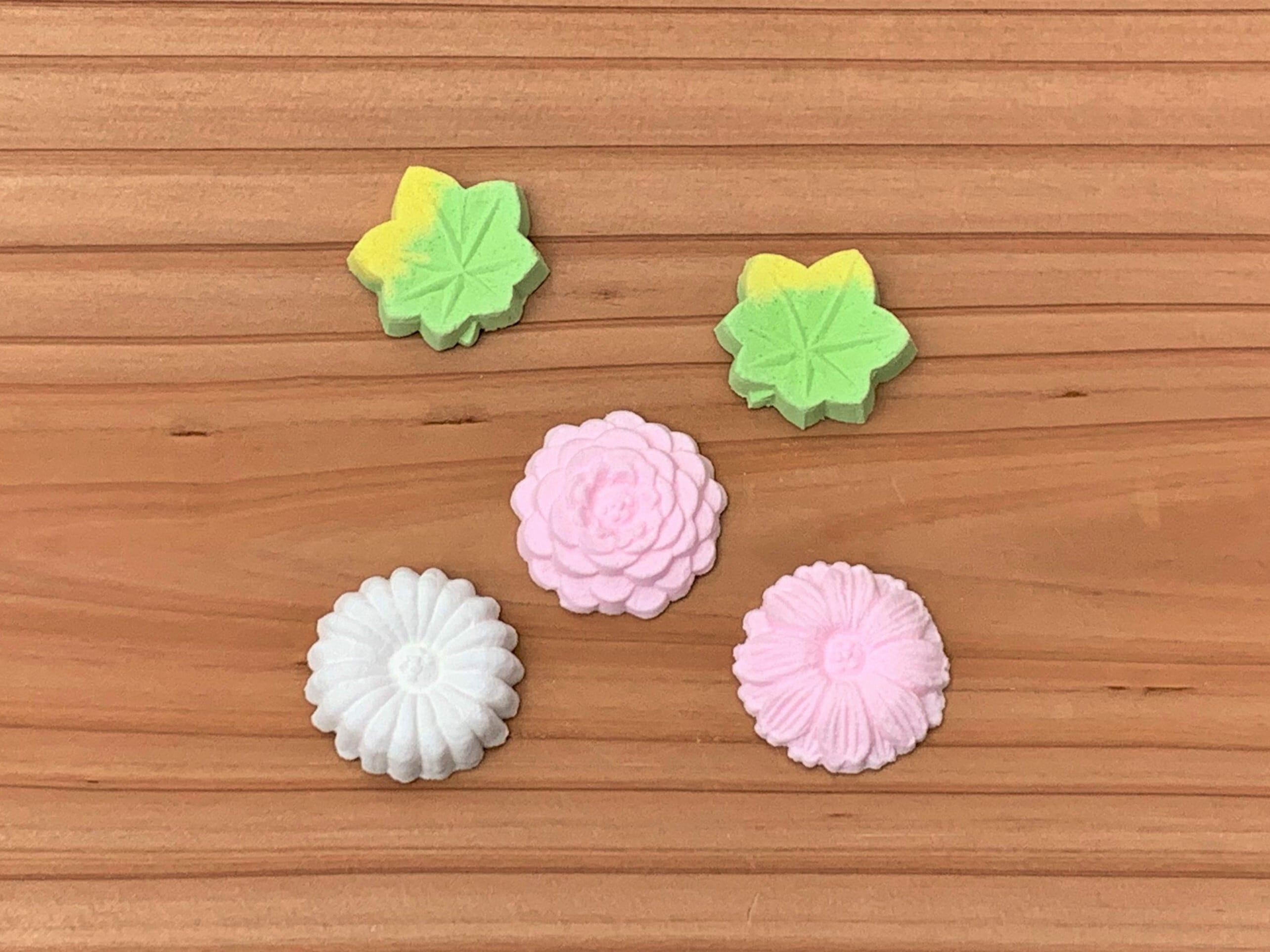 色づき始めた楓の葉と、3種の菊花が入った詰合わせ。