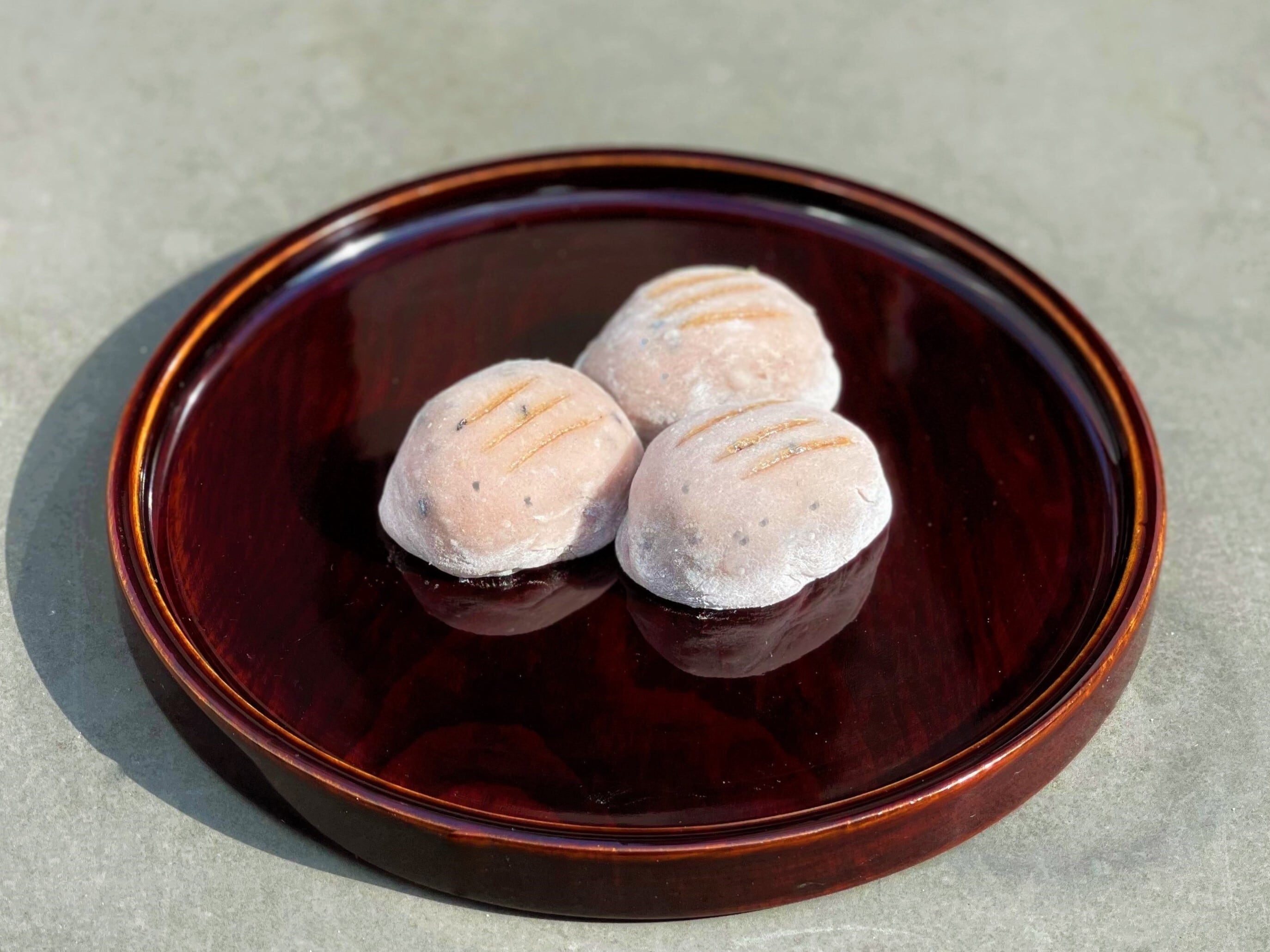 餡と黒ごまを練りこんだ滑らかな求肥餅で、しっとりとしたこし餡を包みました。