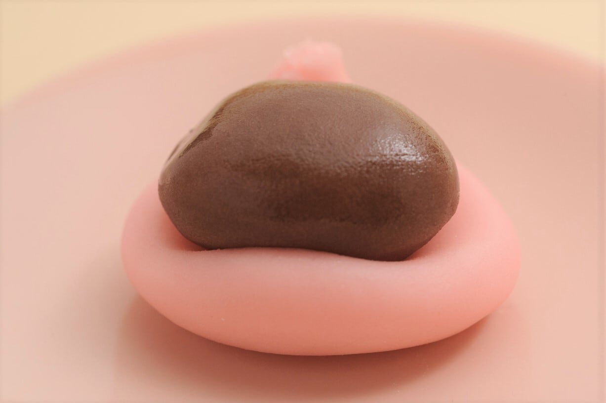 こちらは、ピンクに染めたこなし生地の土台の上に、こしあんを乗せております。