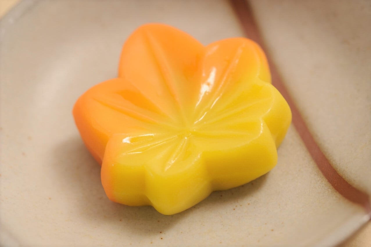 錦繍の秋を模った紅葉のこなしは、表面に寒天を塗って艶をだしております。