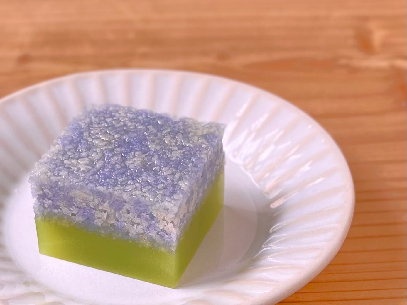 青紫・白色に染め分けた餡をそぼろ状に押し固め蒸した村雨生地と羊羹を重ね合わせたお菓子です。